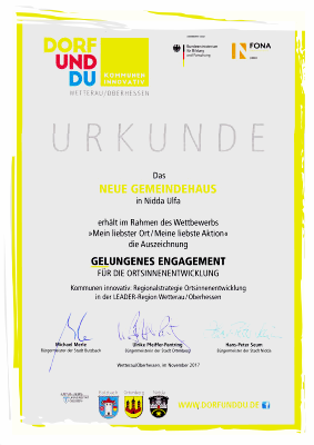 Wir engagieren uns als Gemeinde bei Aktionen im Dorf, so zum Beispiel bei den Wettbewerben "unser Dorf hat Zukunft", bei dem Ulfa 2011 den ersten Platz errang und 2012 eine Auszeichnung für "herausragende Gemeinschaftsleistung für die Aktivitäten im Dorf".